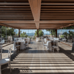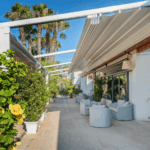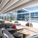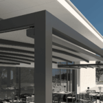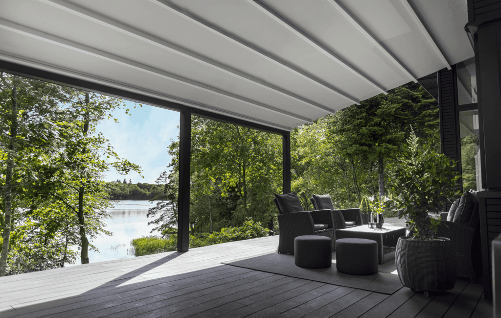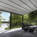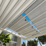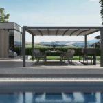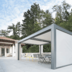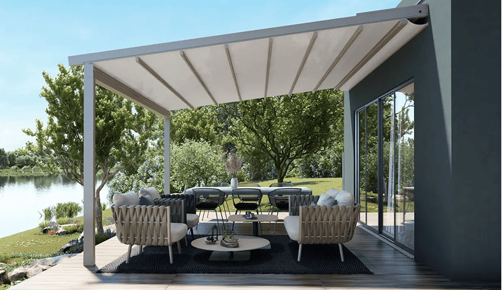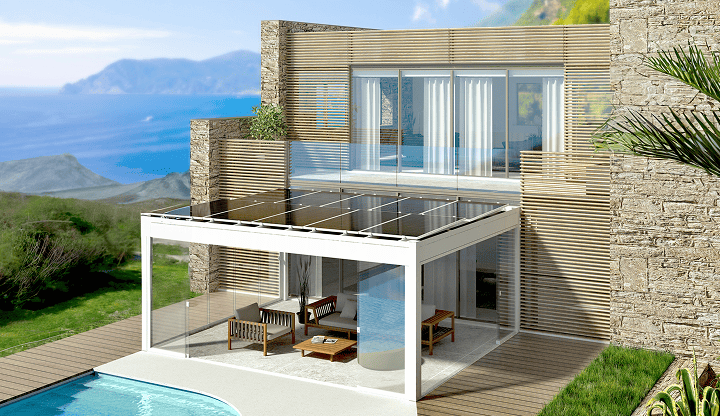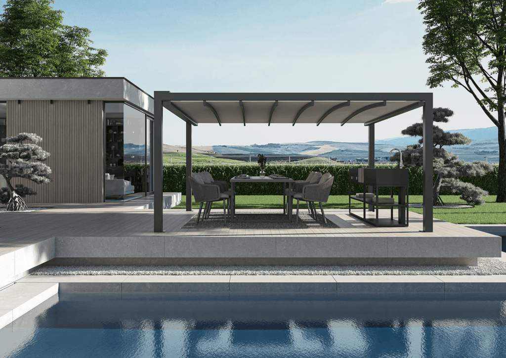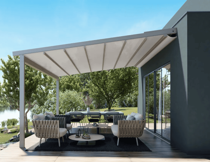 Una pergola con tetto piano e telo mobile a impacchettamento, elegante e minimalista.