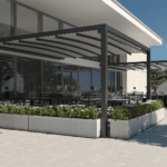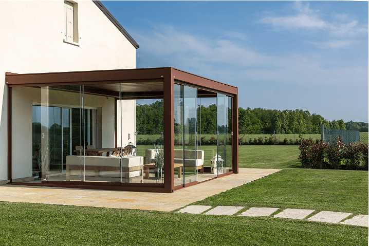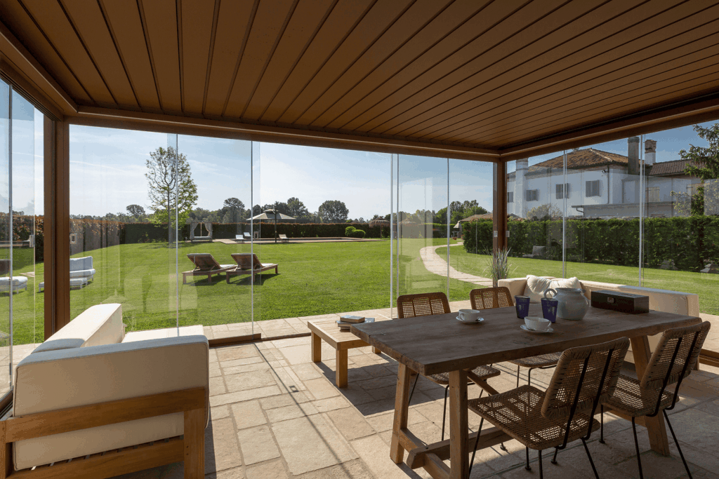 Chiudi gli spazi e apri le possibilità: con vetrate e tende laterali la tua pergola diventa una stanza extra, perfetta per le tue piante, per rilassarti o lavorare. Uno spazio in più che vive con te in ogni stagione.