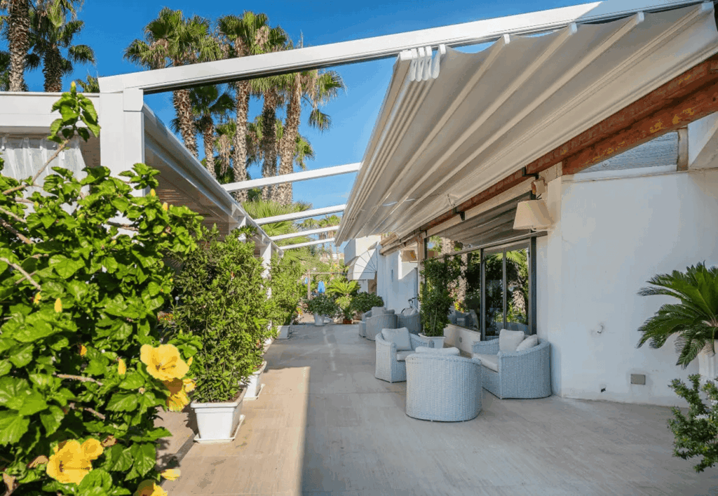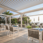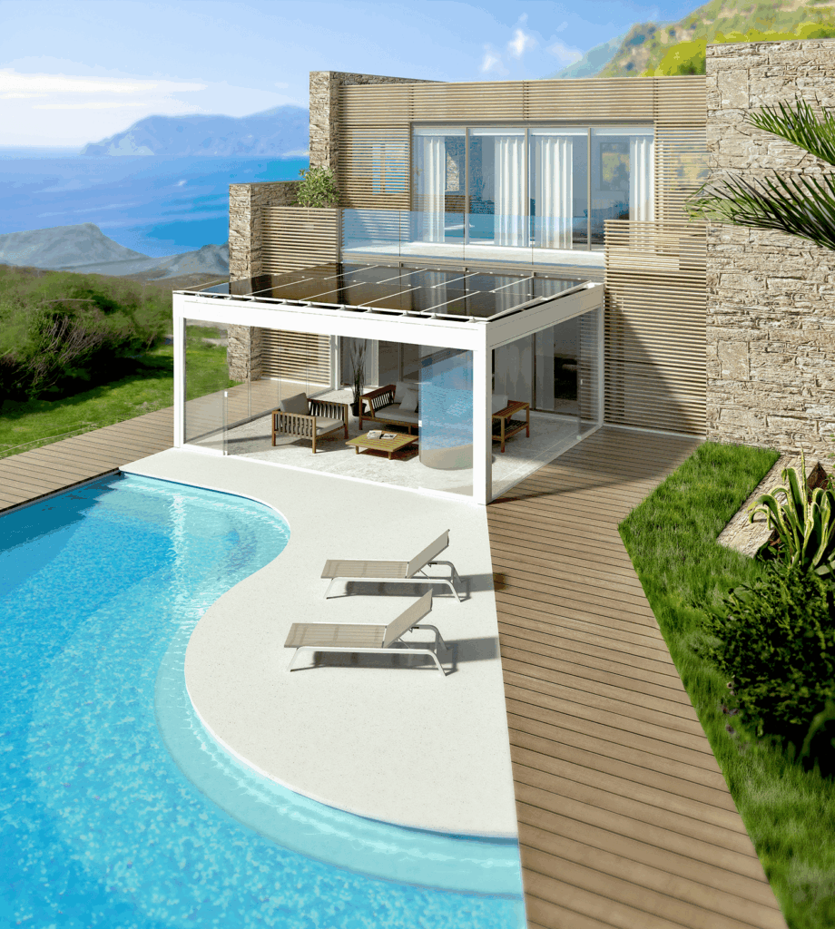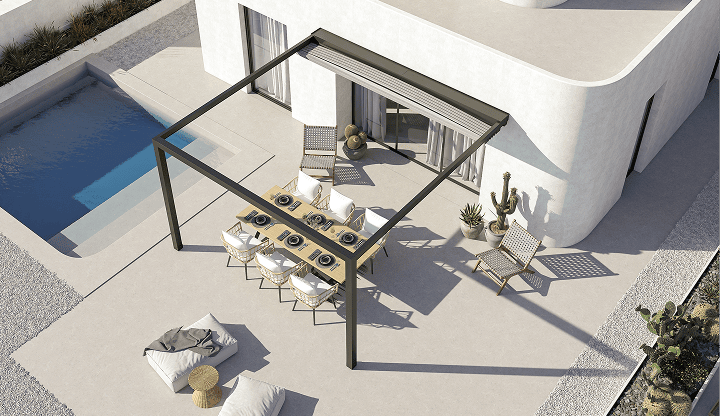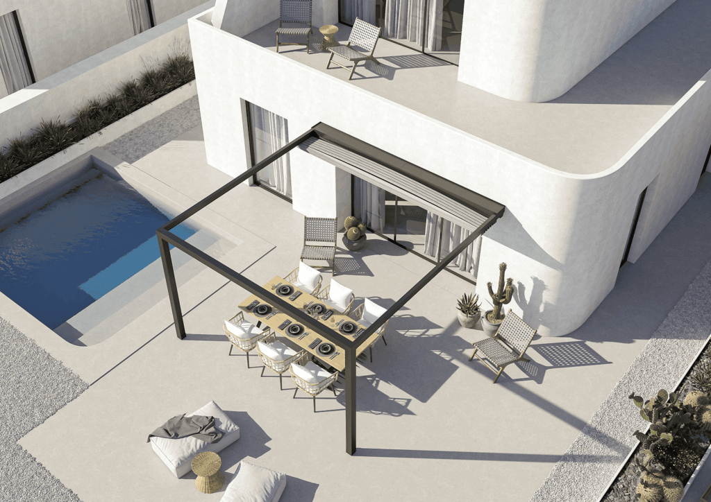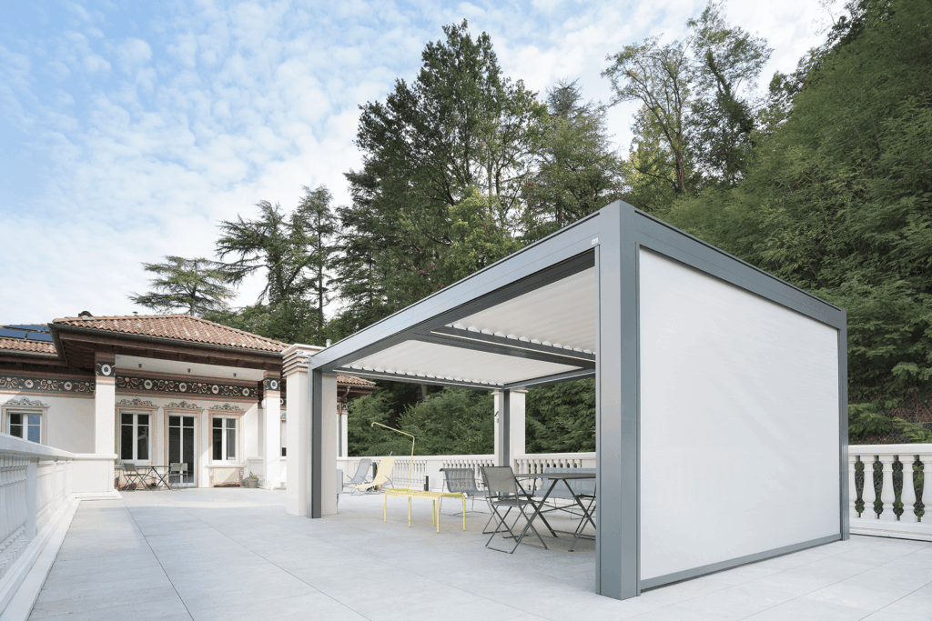 Una pergola con lamelle orientabili o impacchettabili che regola luce, ombra e ventilazione naturale per darti comfort in tutte le stagioni.